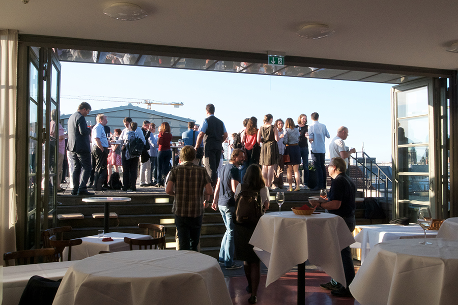li nach re: Prof. Gerd Graßhoff (HU Berlin, EXC Topoi), Prof. Nicolas Apostolopoulos (FU Berlin, CeDiS), Ralf Stockmann (Staatsbibliothek zu Berlin SPK, Innovations-Management), Dr. Anne Baillot (Centre Marc Bloch / Inria, DARIAH-EU), Prof. Marian Dörk (FH Potsdam, Informationsvisualisierung, Urban Complexity Lab) und (in Abwesenheit) Helene Hahn (Projektleiterin in der Open Knowledge Foundation Deutschland e.V.) (Foto: Swantje Bahnsen)