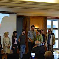 Projektteam 2. Preis "1914-18-online" (FU Berlin und Bayerische Staatsbibliothek, li=>re: Dr. Margit Wunsch Gaarmann, Susanne Büchner, Prof. Nicolas Apostolopoulos, Dr. Hildegart Schäffler (Bayerische Staatsbibliothek)r, Prof. Oliver Janz, Dr. Ivonne Me