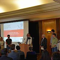 Verleihung 2. Preis für "1914-1918-online" (li=>re: Jana Klawitter | BBAW, Prof. Nicolas Apostolopoulos | FU Berlin, Dr. Hildegart Schäffler | Bayerische Staatsbibliothek, Prof. Oliver Janz | FU Berlin, Elisabeth Lindinger | HTW Berlin)