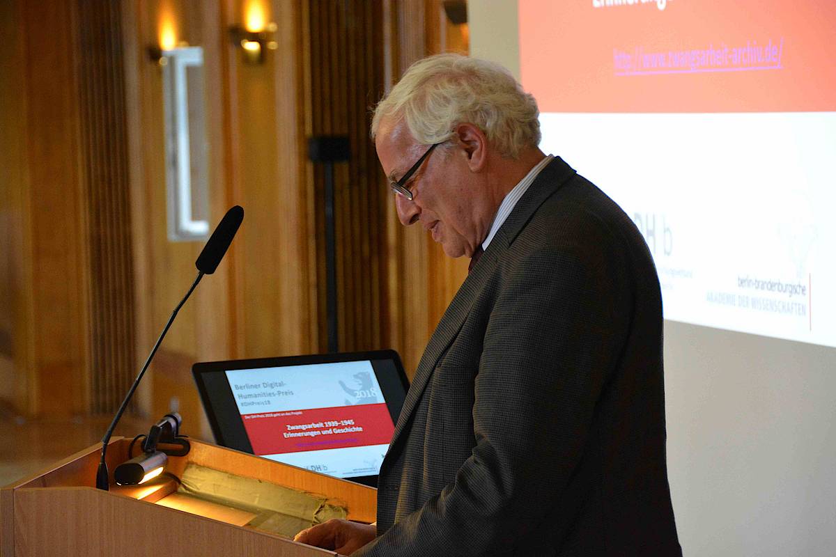 Berliner DH-Preis 2016: Laudatio für den 2. Platz des Berliner DH-Preis 2016 (Corpus Nummorum Thracorum, Münzkabinett Berlin / BBAW): Prof. Gerd Graßhoff (HU Berlin, Sprecher des EXC Topoi) (Foto: Swantje Bahnsen)