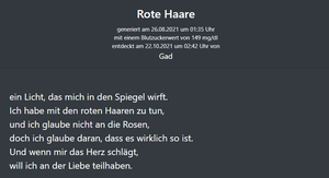 Über 100'000 mal im Jahr misst ein Silikonfaden in meinem Oberarm meinen aktuellen Blutzuckerwert. Als Mensch mit Typ 1 Diabetes sind diese Werte essentiell für mein Diabetes-Management, aber auch eine unmittelbare Bewertung dessen. Zu hohe oder zu niedrige Werte sind daher Garanten für schlechte Laune. Um den Werten einen positiven Zusatznutzen zu verschaffen, habe ich die Gedichtgrube (https://falschegefuehle.de) entwickelt. Dort werden meine Werte von einer künstlichen Intelligenz zu Gedichten verarbeitet. Ich gebe Einblicke in den Entstehungsprozess und die Funktionsweise des Projektes, sowie deren Einfluss auf den Umgang mit meinem Diabetes.