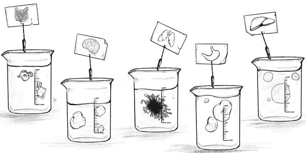 Zukunftsvision: Human-on-a-Chip. Über Mikrokanäle auf einem Chip lassen sich immer mehr Organoidsysteme miteinander verknüpfen. Auf diese Weise kann das Zusammenspiel verschiedener Organe bei Multiorganerkrankungen untersucht werden. So hergestellte Multi-Organoid-Chips könnten eines Tages für Wirkstofftests in der Pharmaindustrie und möglicherweise auch für klinische Studien eingesetzt werden oder als Stellvertreter einer Patientin oder eines Patienten helfen, die beste Wirkstoffkombination für eine individuelle Therapie ausfindig zu machen. Die Verlässlichkeit der Ergebnisse entsprechender Untersuchungen an Multi-Organoidsystemen und ihre Übertragbarkeit auf Patienten und Patientinnen muss jedoch zuvor validiert werden. Die Abbildung ist stark vereinfacht und eine vollständige Repräsentation eines Menschen auf einem Chip ist auf absehbare Zeit nicht möglich.