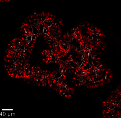 Humanes Pankreasorganoid. Im Gegensatz zu Magen- und Darmorganoiden werden Pankreasorganoide auf Basis pluripotenter Stammzellen hergestellt. Dieses Pankreasorganoid ist im Querschnitt dargestellt, rot eingefärbt sind die Zellkerne der Pankreas-Vorläuferzellen erkennbar. Ein wichtiges Ziel der Forschung an Pankreasorganoiden ist, die molekularen Mechanismen, die in die Entstehung insulinproduzierender Betazellen involviert sind, besser zu verstehen und idealerweise gezielt zu beeinflussen. Wenn sich diese aus Vorläuferzellen gezielt differenzieren ließen, könnten langfristig Diabetespatienten – und patientinnen durch eine solche Zellersatztherapie geheilt werden, so die Vision der Forschenden.