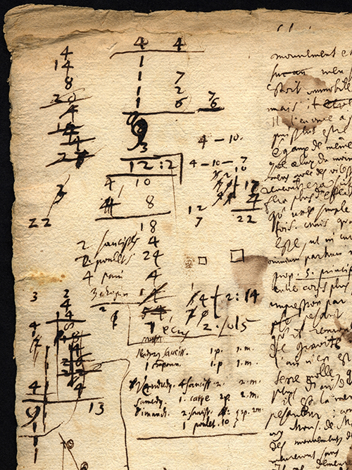 Das mediale Interesse galt aber nicht Leibniz’ Exzerpten, die fast das ganze Blatt einnehmen, und auch nicht seinen eigenen Überlegungen und Rechnungen, die er davon ausgehend über die Gesetze des physikalischen Stoßes anstellte und auf dem frei gelassenen Rand des Blattes niederschrieb. Ganz andere Rechnungen sorgten für Aufsehen. Sie nehmen nur einen kleinen Teil auf dem Blatt ein und stehen in der linken oberen Ecke. Darin geht es nicht um Körper, Geschwindigkeiten und Gewichte. Gerechnet wird mit Würsten, Hühnchen, Brot und Wein – „saucisses“, „poulets“, „pain“, „chopine“, und zwar sowohl in absoluten Mengen und mit Preisangaben als auch verteilt auf einzelne Tage in Form einer Tabelle. Für Donnerstag sind darin zwei Würste vermerkt, für Freitag vier Würstchen, für Samstag sogar ein Karpfen („1 carpe“) und für Sonntag zwei Würstchen und ein Hühnchen.